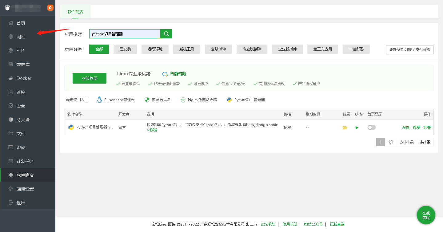 登录宝塔面板,进入软件商店,搜索“python项目管理器”然后点击安装
